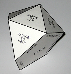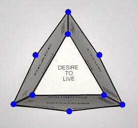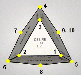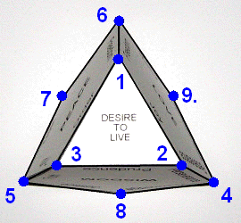 Looking at the "seed" from the bottom we can see all of the vertices. In this way you can also see all of the features at the same time. Visible in the center is the Desire to Live. We can jokingly say that the easiest way to judge us is to look at our goodness from the side of the Desire to Live. This is because you can see the directions in which our features are developing and you can also see the position of the Desires of Action as distinguished by the upper vertices (in the accompanying illustration they are the vertices situated away from the Desire to Live). All of this is a testament to the "volume" of our "seed".