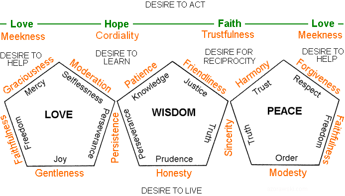 W) Each vertex in the "seed" thus represents: the Father, Son and Holy Spirit, the three persons of the Trinity, which as considered by St. Gregory of Nazianzus, are equal to each other (Catechism: 256). The components of good are also "highlighted" or particularly supported by the individual persons of the Trinity. From each vertex of the "seed" they take the beginning, or combine with a component of good, but each component is "highlighted" by another person of the Trinity which I call "feature T". I marked them in the following table: (F) - means the Father, (S) - Son, and (H) - the Holy Spirit. Components will never communicate with each other when they have the same "feature T". Each vertex of the "seed" joins: a component of the characteristic F, a component of the characteristic S and component of the characteristic H: F,S,H. Connections such as F,F,H or S,H,S or H,H,H, etc., do not occur. Faith, Hope and Love do not have this kind of "unipolar characteristic" for the spiritual significance of what they represent, because then it would upset balance of the "features T" in connections with the components of good in the top vertices of the "seed". Take the example of Faith, which on the one hand is in contact with Knowledge (S) and Justice (F), on the other hand, Trust (H) and Respect (F). Faith should therefore on one hand have a characteristic (H), and on the other (S) be connected by the principle laid down by the "features T". However, the Trinity is a combination of three equally valid divine Persons, so Faith, Hope and Love are equally represented by the three persons of the Trinity, and when in contact with constituents of the characteristics of good produce an adequate "feature T" at the point of joining, as if putting the third person "in the middle". Moreover, their described position in the "seed" is only possible if there is an inseparable triangle, meaning they can not be treated as separate components represented by a segments. The vertices of the Faith-Hope-Love triangle represent the Father, Son and Holy Spirit. The triangle is not a component of our goodness, it is the gift of the Holy Trinity for us. It helps us divide our Desires of Actions when connects to the triangle of Trustfulness-Cordiality-Meekness. Here you can find a symbolic analogy to the gifts that the Child Jesus received from the Three Kings (Matthew 2:11). These gifts can be used or not used, it just depends on our will. God believes and has confidence in us and hopes that we will meet with him and his love sustains us through our spiritual journey. It is up to ourselves whether we want to meet him. The Second Vatican Council teaches: "man's response to God by faith must be free, and... therefore nobody is to be forced to embrace the faith against his will. The act of faith is of its very nature a free act" (Catechism: 160).