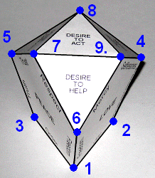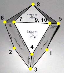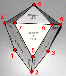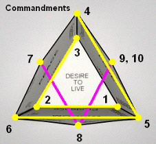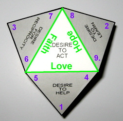 Z) In returning to consider point X, we see that the behavior of the first humans led to the deepening of their wisdom and they began to distinguish between good and evil. But their wisdom, gained in this easy manner and not supported by experience was incomplete, and their will became prone to evil. Linking the design of the ideal " seed" with the rosary (point Y) and the nine blessings of the Lord Jesus (point S) clearly indicates that humans are able to obtain the peaks of Peace, Wisdom and Love. Jesus sets for us the optimal way that can protect us from the workings of evil. The only way to achieve true Wisdom is to take the way not chosen by the first people, the road that leads from Peace through Love. The Lord Jesus emphasizes this by the order of blessings. Referring to the conclusions of point. S and taking into account the order of the blessings we will see that our spiritual journey through life starts from the vertex of the base, where the Desire To Live meets with Truth (vertex-blessing 1). As our journey leads us higher and its aim is to achieve peaks, I will use terms associated with mountaineering to illustrate my points in this discussion. The truth is still an unknown edge to us as we begin our journey. We can only note that it extends at an angle to the top and we can be detached from it because we still do not know how to climb. We start to find the road leading to the mountaintop, so we pass horizontally through Peace taking the way of Order, we hook onto Freedom (2) and guided by Joy we pass through Love to Wisdom, where we carefully follow Prudence and arrive at Truth (3). Therefore, we circumnavigate our mountain and familiarize ourselves with its size and shape while learning how to climb. Next we start to climb following Truth and as we move our spirit to higher peaks, we gain the valley of Justice and Trust (4), which is part of the slope of the Desire for Reciprocity. In continuing our journey we pass through Peace and following Freedom we gain the valley of Respect and Mercy (5), which is part of the slope of the Desire to Help. Persistently following Love we gain the valley of Selflessness and Knowledge (6) belonging to the slope of the Desire to Learn. Following Wisdom we ascend the wall of Peace and climb the edge of Trust to its peak (7). Being at the peak of Peace, the Lord Jesus shows us the way to the summit of Wisdom (8), directing us to the edge of Faith. After following this edge we then follow the edge of Hope and gain the peak of Love (9). This is the last summit we can gain and we are ready to meet God.