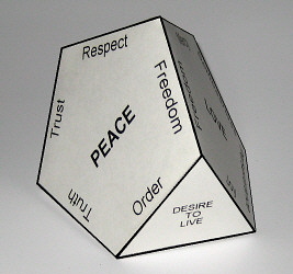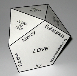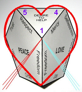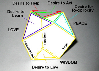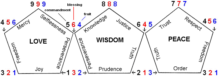 In this way we obtain 3 pentagons: Love, Wisdom and Peace. They are constructed so that their bases are the principal ingredients out of which grow the sides representing the uplifting components and the peaks of the edges representing the components of expansion. We can connect the pentagons by matching up common sides: Love and Wisdom are connected by Perseverance, Wisdom and Peace by Truth, and Peace and Love by Freedom. This creates a structure in the shape of a "crown" that rests on the base of an equilateral triangle.